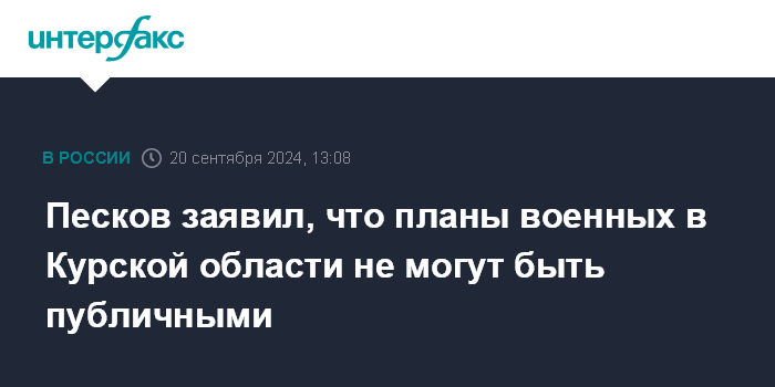 Москва. 20 сентября. INTERFAX.RU - Российские военные в Курской области делают свою работу, их планы не могут быть публичными, но ситуация своевременно будет исправлена и контроль РФ везде будет восстановлен, заявил пресс-секретарь президента России Дмитрий Песков.