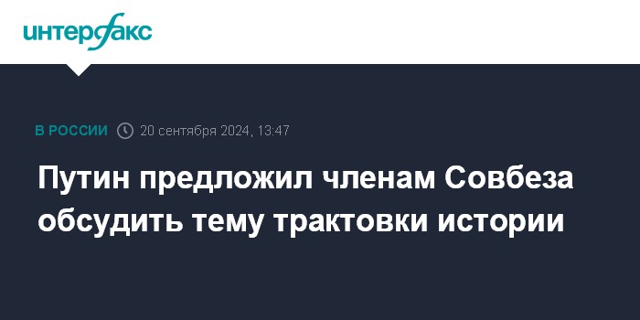 Москва. 20 сентября. INTERFAX.RU - Президент Владимир Путин на совещании с постоянными членами Совета безопасности предложил обсудить тему объективной трактовки истории. Совещание он провел по ВКС из Петербурга.