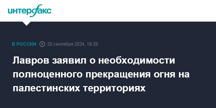 Москва. 20 сентября. INTERFAX.RU - Россия выступает за полноценное прекращение огня в секторе Газа и в целом на палестинских территориях, заявил телеканалу Sky News Arabia глава российского МИД Сергей Лавров.