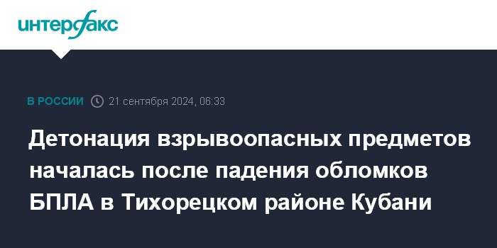 Детонация взрывоопасных предметов началась после падения обломков БПЛА в Тихорецком районе Кубани