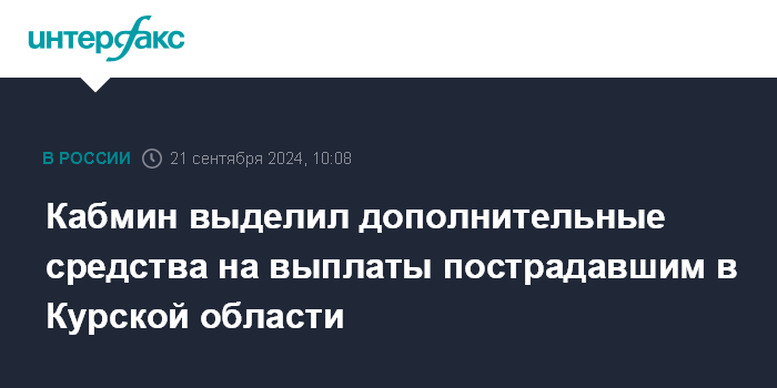 Москва. 21 сентября. INTERFAX.RU - Правительство РФ по поручению президента Владимира Путина приняло решение о дополнительном финансировании на выплату единовременной помощи жителям Курской области, сообщил сайт кабинета министров в субботу.