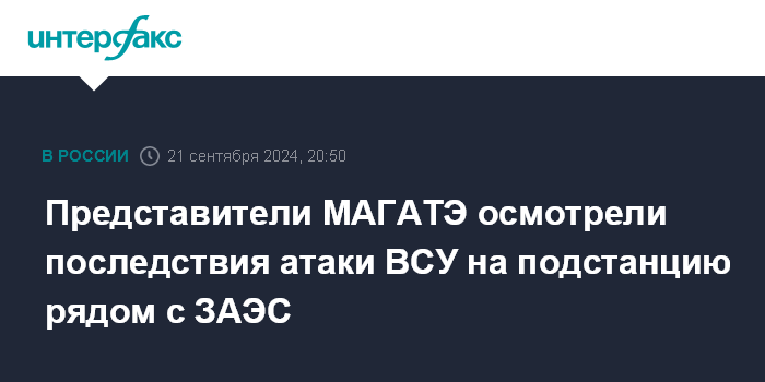 Москва. 21 сентября. INTERFAX.RU - Инспекторы МАГАТЭ осмотрели последствия атаки ВСУ на питающую инфраструктуру Запорожской АЭС подстанцию "Заря", сообщили представители станции.