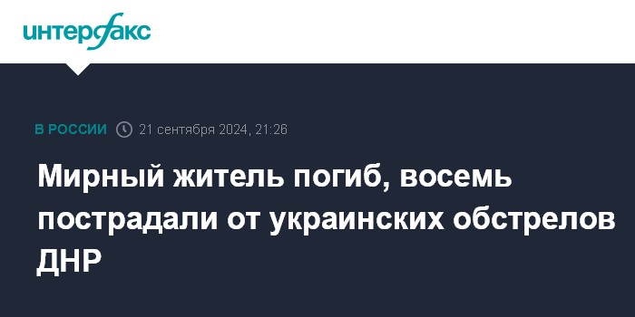 Москва. 21 сентября. INTERFAX.RU - Мирный житель погиб, еще восемь пострадали в результате обстрелов территории Донецкой народной республики (ДНР) в субботу, сообщил глава республики Денис Пушилин.
