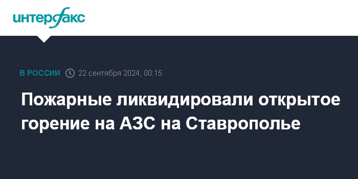 Москва. 22 сентября. INTERFAX.RU - Пожарные Ставрополья ликвидировали открытое горение на АЗС в Новоселицком округе, где накануне вечером загорелся бензовоз.