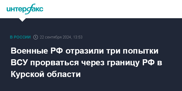 Москва. 22 сентября. INTERFAX.RU - Российские военнослужащие в течение суток отразили три попытки вооруженных сил Украины прорваться через границу России на курском направлении, сообщило министерство обороны РФ в воскресенье.