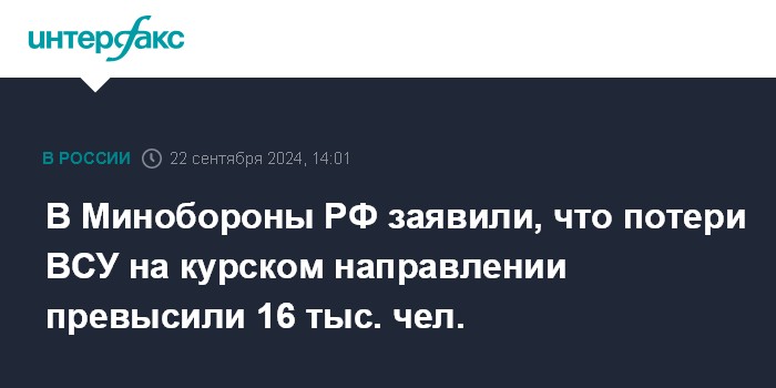 Москва. 22 сентября. INTERFAX.RU - Украинские силы в ходе боевых действий на курском направлении потеряли более 16 тыс. человек, за сутки потери ВСУ поставили более 380 военнослужащих, сообщили в Минобороны РФ.