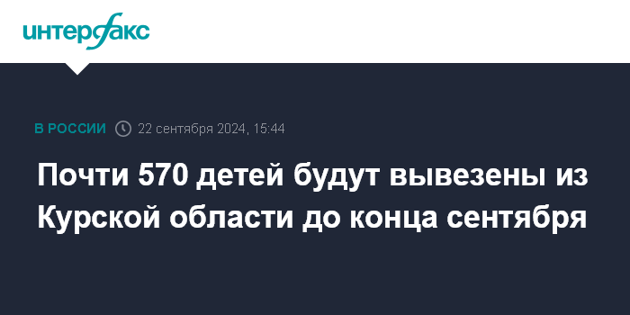 Москва. 22 сентября. INTERFAX.RU - До конца сентября планируется вывезти из Курской области в ряд регионов страны еще 568 детей, сообщил в воскресенье глава области Алексей Смирнов.