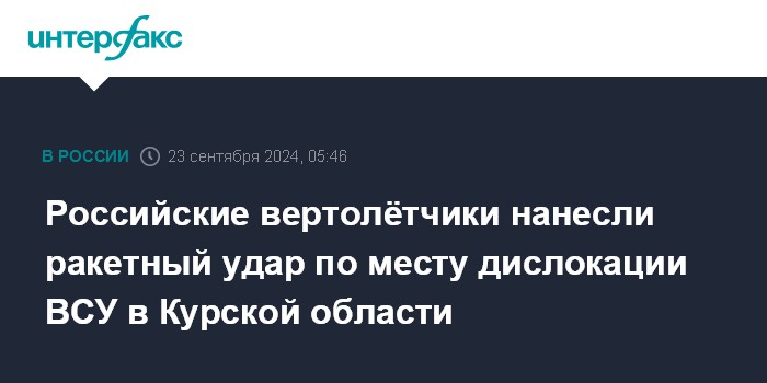 Москва. 23 сентября. INTERFAX.RU - Ракетный удар по скоплению живой силы и бронированной технике подразделений украинской армии в курском приграничье нанёс экипаж вертолёта Ми-28НМ армейской авиации, заявило Министерство обороны РФ.