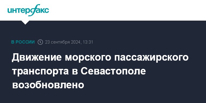Москва. 23 сентября. INTERFAX.RU - Морской пассажирский транспорт в Севастопольской бухте возобновил работу после временной остановки в понедельник, информирует телеграм-канал дирекции по развитию дорожно-транспортной инфраструктуры города.