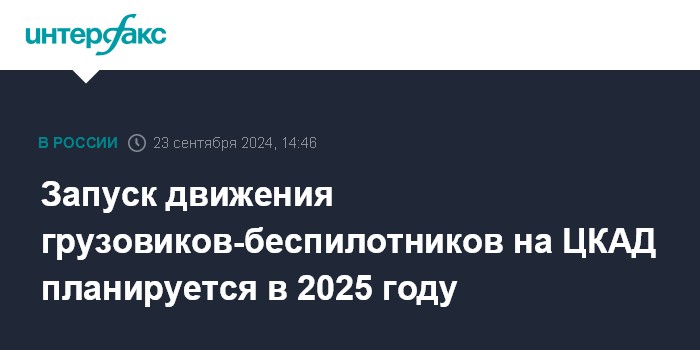 Москва. 23 сентября. INTERFAX.RU - Проект беспилотных грузоперевозок, уже реализованный на трассе М11 "Нева", планируется распространить на Центральную кольцевую автодорогу (ЦКАД), а также трассу М12 "Восток", сообщил глава Минтранса РФ Роман Старовойт.