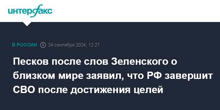 Москва. 24 сентября. INTERFAX.RU - В Кремле отреагировали на заявление Владимира Зеленского о близком мире, подчеркнув, что специальная военная операция будет завершена, как только цели РФ будут достигнуты.