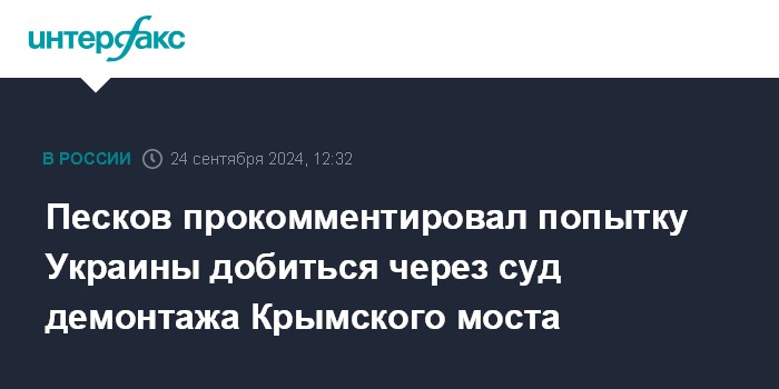 Москва. 24 сентября. INTERFAX.RU - Позиция России относительно всей ее инфраструктуры, включая Крымский мост, понятна и является превалирующей, заявил пресс-секретарь президента Дмитрий Песков.