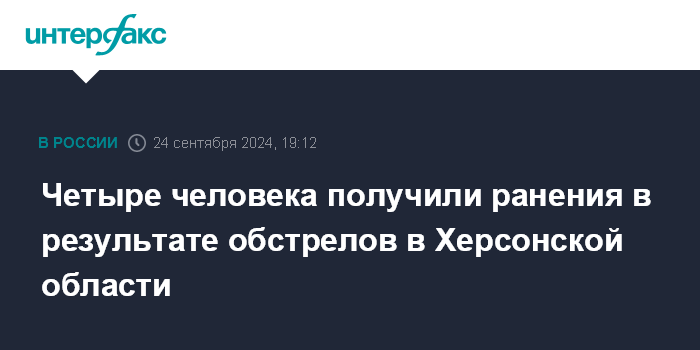Москва. 24 сентября. INTERFAX.RU - Четыре человека ранены в результате обстрела населенных пунктов Херсонской области со стороны ВСУ, сообщил во вторник губернатор региона Владимир Сальдо.