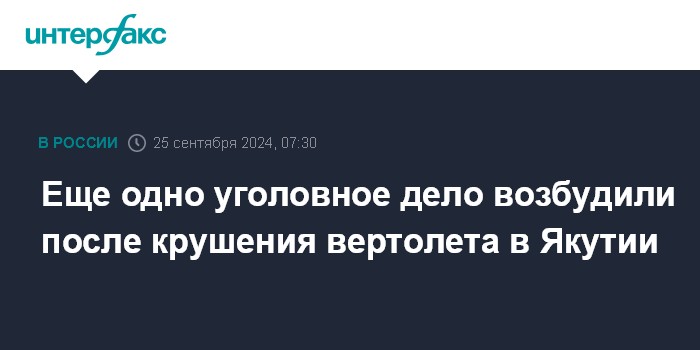 Москва. 25 сентября. INTERFAX.RU - Уголовное дело о подделке государственного регистрационного знака возбуждено после крушения вертолета Robinson R44II в Якутии, сообщает Восточно-Сибирская транспортная прокуратура.