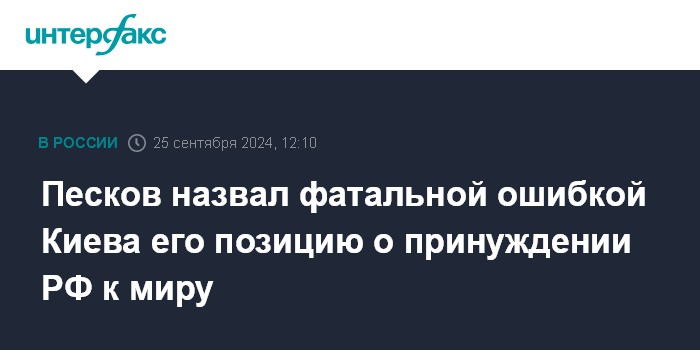 Москва. 25 сентября. INTERFAX.RU - Уверенность властей Украины, что Россию можно только "принудить к миру", является фатальной ошибкой, заявил пресс-секретарь президента РФ Дмитрий Песков.