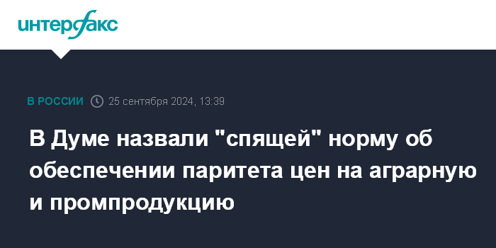 Москва. 25 сентября. INTERFAX.RU - Норма закона, которая обязывает государство мониторить индексы цен на продукцию сельского хозяйства и материально-технические ресурсы для АПК и обеспечивать их паритет, пока находится в спящем состоянии. Надо ее активно использовать, чтобы видеть реальные причины роста цен на продукты питания, считает вице-спикер Госдумы Алексей Гордеев.