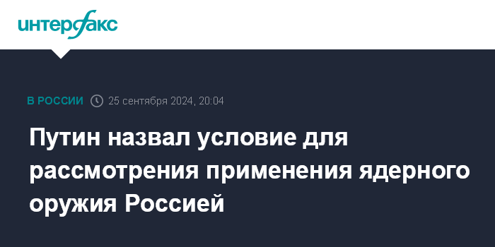 Москва. 25 сентября. INTERFAX.RU - Россия будет рассматривать возможность применения ядерного оружия уже при получении достоверной информации о массированном старте средств воздушно-космического нападения, заявил президент Владимир Путин на заседании постоянного совещания Совета безопасности России по ядерному сдерживанию.