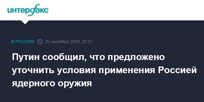 Москва. 25 сентября. INTERFAX.RU - Президент РФ Владимир Путин заявил о внесении ряда уточнений в условия применения Россией ядерного оружия.