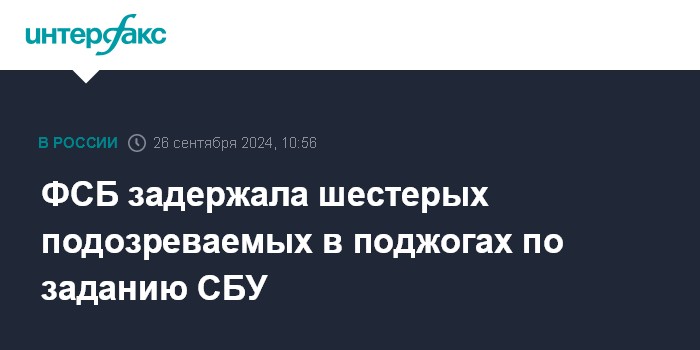 Москва. 26 сентября. INTERFAX.RU - ФСБ сообщила о задержании в Иркутской, Нижегородской и Самарской областях шестерых россиян, подозреваемых в причастности к поджогам объектов инфраструктуры железнодорожного транспорта и связи по заданию украинских спецслужб.