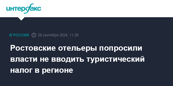 Москва. 26 сентября. INTERFAX.RU - Ассоциация профессионалов индустрии гостеприимства (АПИГ) Ростовской области обращается к властям региона с просьбой не вводить туристический налог, сообщила "Интерфаксу" президент Ассоциации Елена Папиж.