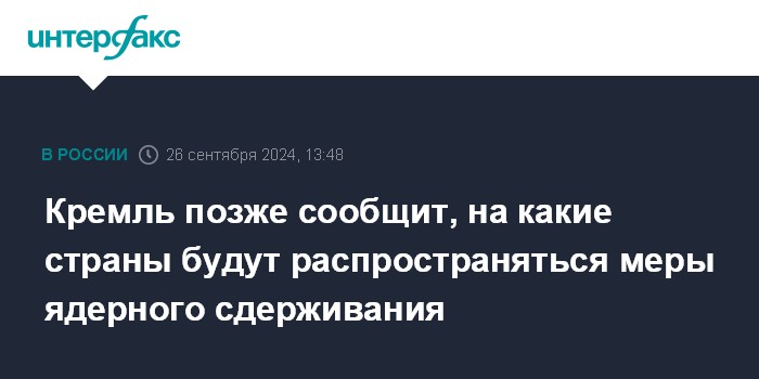 Москва. 26 сентября. INTERFAX.RU - Список стран и альянсов, на которые будут распространяться меры ядерного сдерживания, станет известен позже, заявил пресс-секретарь президента РФ Дмитрий Песков.