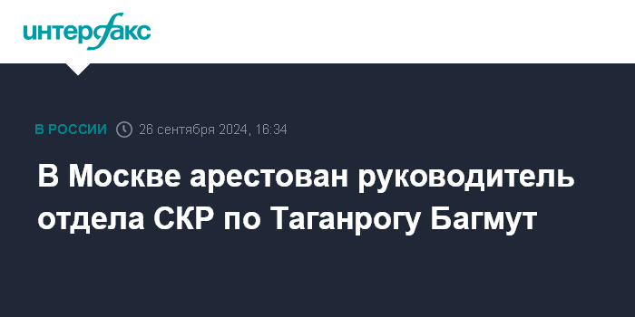 Москва. 26 сентября. INTERFAX.RU - Басманный суд Москвы арестовал на два месяца руководителя отдела по Таганрогу управления СКР по Ростовской области Руслана Багмута, сообщили "Интерфаксу" в пресс-службе УФСБ по Ростовской области.