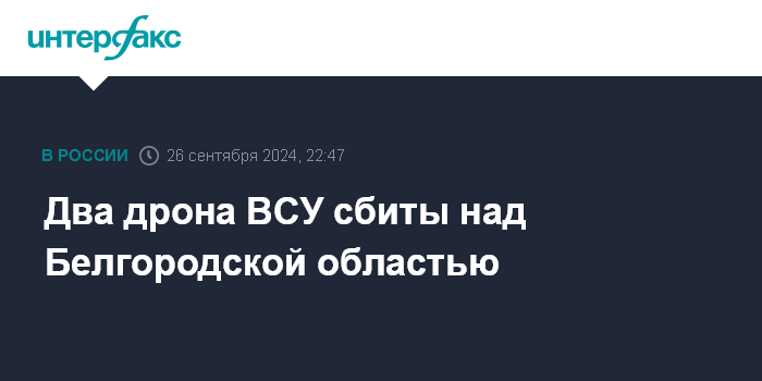 Москва. 26 сентября. INTERFAX.RU - Средства противовоздушной обороны около 21:50 по Москве уничтожили два украинских беспилотника над Белгородской областью, сообщили в Минобороны РФ.