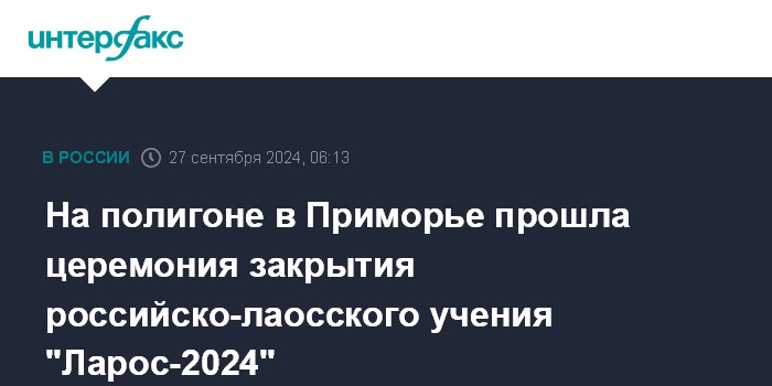 Москва. 27 сентября. INTERFAX.RU - На общевойсковом полигоне "Сергеевский" в Приморском крае состоялась торжественная церемония закрытия российско-лаосского военного учения "Ларос-2024", сообщило Минобороны РФ.