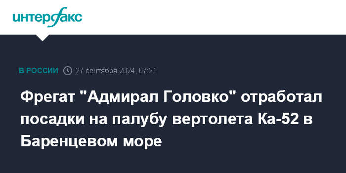 Москва. 27 сентября. INTERFAX.RU - Фрегат Северного флота "Адмирал Головко" отработал прием на палубу вертолета корабельного базирования Ка-52К "Катран" во время стоянки на якоре в Кольском заливе и в Баренцевом море, сообщает пресс-служба Северного флота в пятницу.