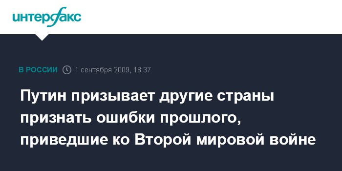 "Нужно признать эти ошибки. Наша страна сделала это. Государственная Дума РФ, парламент страны осудили пакт Молотова-Риббентропа. Мы вправе ожидать того, чтобы и в других странах, которые пошли на сделку с нацистами, было это тоже сделано. И не на уровне заявлений политических лидеров, а на уровне политических решений", - заявил В.Путин во вторник на памятной церемонии в Гданьске, приуроченной к 70-лети. начала Второй мировой войны.