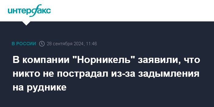 В компании "Норникель" заявили, что никто не пострадал из-за задымления на руднике