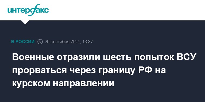 Москва. 29 сентября. INTERFAX.RU - Российские военные сообщили, что отразили шесть попыток ВСУ прорваться через границу РФ в направлении населенного пункта Новый Путь в Курской области.