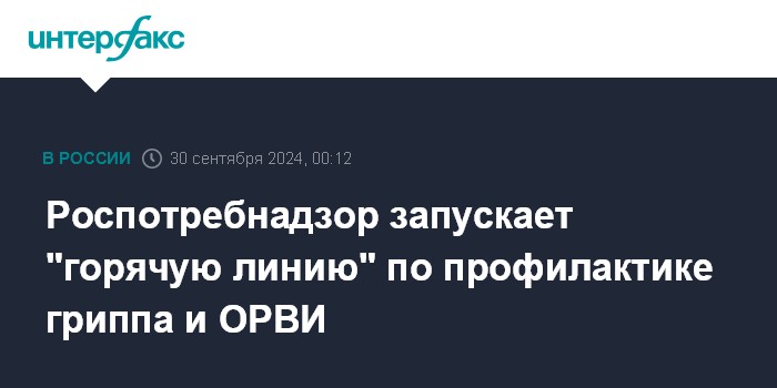 "30 сентября во всех регионах России начинает работу тематическая горячая линия Роспотребнадзора по вопросам профилактики гриппа и ОРВИ. Консультацию специалистов ведомства можно получить до 11 октября", - говорится в сообщении, опубликованном в официальном телеграм-канале ведомства.