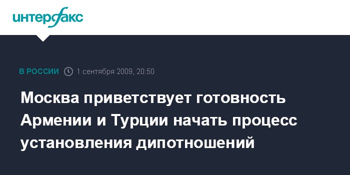 Москва. 1 сентября. INTERFAX.RU - В Москве приветствуют готовность Армении и Турции начать согласования с целью установления дипломатических отношений.
