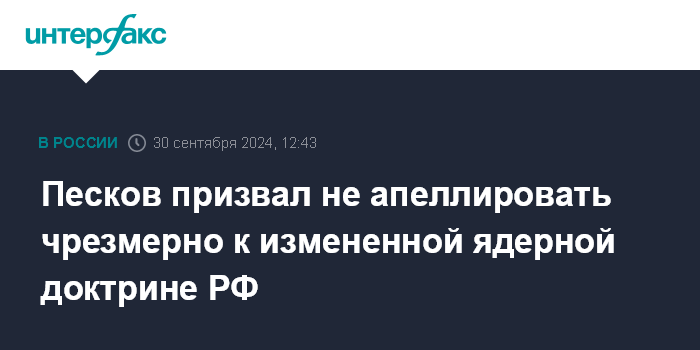 Москва. 30 сентября. INTERFAX.RU - Пресс-секретарь президента РФ Дмитрий Песков призвал не апеллировать к измененной ядерной доктрине страны после каждой атаки украинских беспилотников.