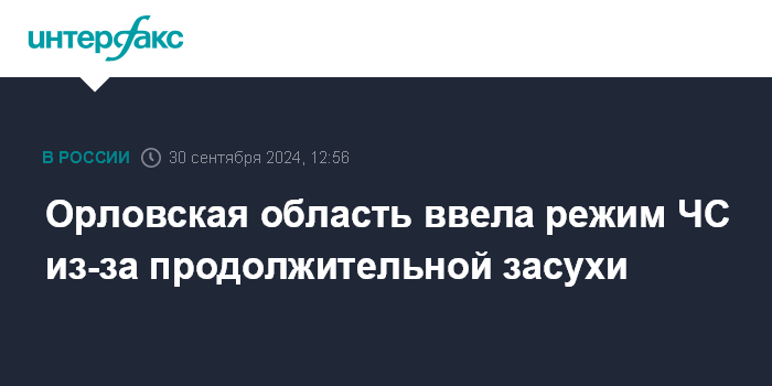 "В связи со сложной обстановкой в агропромышленном комплексе на территории Орловской области, сложившейся в результате опасного агрометеорологического явления – засухи атмосферной, приведшего к гибели посевов озимых сельскохозяйственных культур, зафиксированного в период с 5 августа по 23 сентября 2024 года, правительство Орловской области постановляет: ввести с 30 сентября на территории Орловской области (...) режим чрезвычайной ситуации", - говорится в постановлении, опубликованном правительством региона.