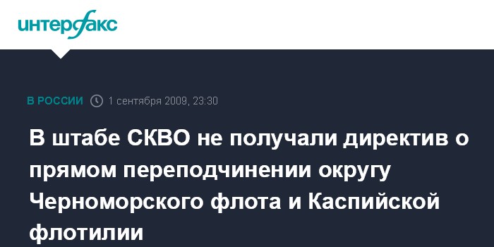 Москва. 1 сентября. ИНТЕРФАКС-АВН - Никаких директив о прямом переподчинении командованию Северокавказского военного округа (СКВО) сил и средств Черноморского флота, а также Каспийской флотилии на данный момент не поступало, сообщили "Интерфаксу-АВН" во вторник в штабе СКВО.