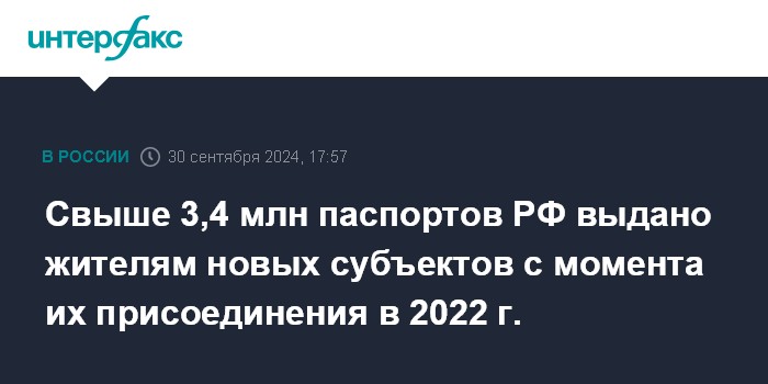 Москва. 30 сентября. INTERFAX.RU - Сотрудники МВД оформили почти 3,5 млн российских паспортов жителям Донецкой и Луганской народных республик, Запорожской и Херсонской областей с момента их присоединения к России в 2022 году, сообщила официальный представитель министерства Ирина Волк.