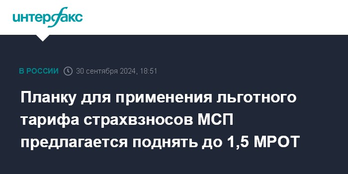 Планку для применения льготного тарифа страхвзносов МСП предлагается поднять до 1,5 МРОТ