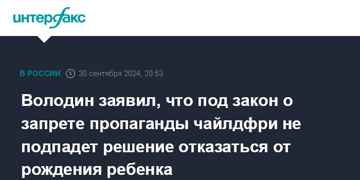 Москва. 30 сентября. INTERFAX.RU - Законопроект о запрете пропаганды идеологии чайлдфри не будет распространяться на решение женщины отказаться от рождения ребенка, заявил председатель Госдумы Вячеслав Володин.