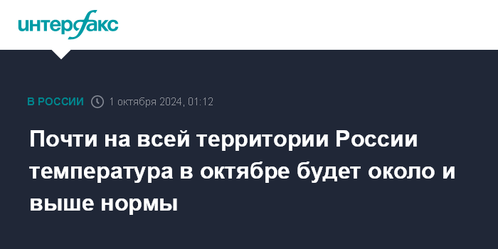 Москва. 1 октября. INTERFAX.RU - Температура выше нормы в октябре прогнозируется в южной половине европейской части России, на Урале и в Сибири, почти на всей остальной территории страны температура будет около нормы, сообщил "Интерфаксу" научный руководитель Гидрометцентра России Роман Вильфанд.