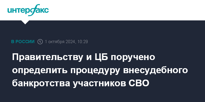 Москва. 1 октября. INTERFAX.RU - Президент Владимир Путин поручил правительству и Банку России рассмотреть вопрос об установлении особенностей внесудебного банкротства для участников СВО.
