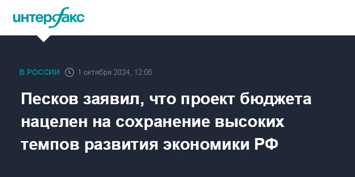 Песков заявил, что проект бюджета нацелен на сохранение высоких темпов развития экономики РФ