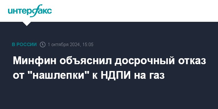 Москва. 1 октября. INTERFAX.RU - Запланированная с 1 января 2025 года отмена "нашлепки" к НДПИ на газ будет направлена на инвестиционную программу "Газпрома", сообщили в пресс-службе Минфина.