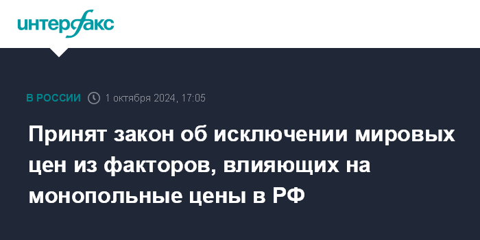 Москва. 1 октября. INTERFAX.RU - Госдума приняла закон, согласно которому изменение цен на мировых товарных рынках не будет учитываться при определении монопольно высокой или низкой цены товара для хозяйствующих субъектов на внутреннем российском рынке.