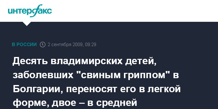 Москва. 2 сентября. INTERFAX.RU - В группе владимирских школьников, заболевших гриппом А (H1N1)09 на отдыхе в Болгарии, 10 человек заражены легкой формой гриппа, два человека переносят его в средней форме.