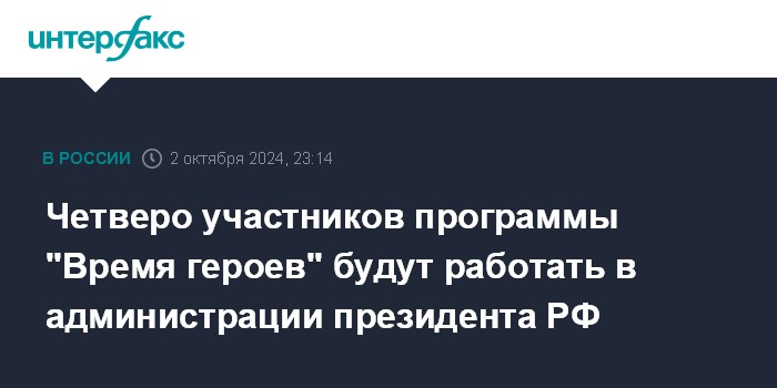 Москва. 2 октября. INTERFAX.RU - Президент РФ Владимир Путин заявил, что четыре участника программы "Время героев" будут работать в его администрации.