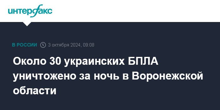 Москва. 3 октября. INTERFAX.RU - Губернатор Воронежской области Александр Гусев сообщил об уничтожении нескольких десятков украинских беспилотников в небе над регионом минувшей ночью.