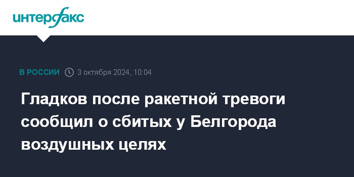 Москва. 3 октября. INTERFAX.RU - Несколько воздушных целей были сбиты ПВО на подлете к Белгороду, сообщил губернатор региона Вячеслав Гладков. Примерно за полчаса до этого он сообщал о ракетной опасности, ее объявляли на несколько минут.