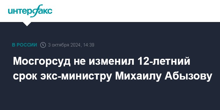Москва. 3 октября. INTERFAX.RU - Мосгорсуд оставил в целом неизменным приговор Преображенского суда, который в декабре 2023 года приговорил к 12 годам колонии строгого режима бывшего министра по делам Открытого правительства Михаила Абызова по делу о преступном сообществе и мошенничестве.